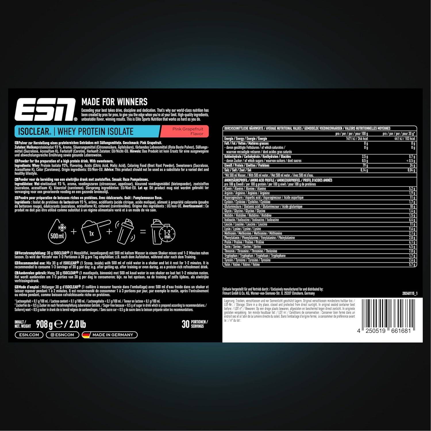 - INNOVATION: Das patentierte Isoclear Whey Isolate ist sehr leicht verdaulich, natürlich schonend hergestellt und deshalb intakt und biologisch hoch verfügbar. Das exzellente Aminosäurenprofil mit 48,9 % EAAs und 22,7 % BCAAs ist herausragend!